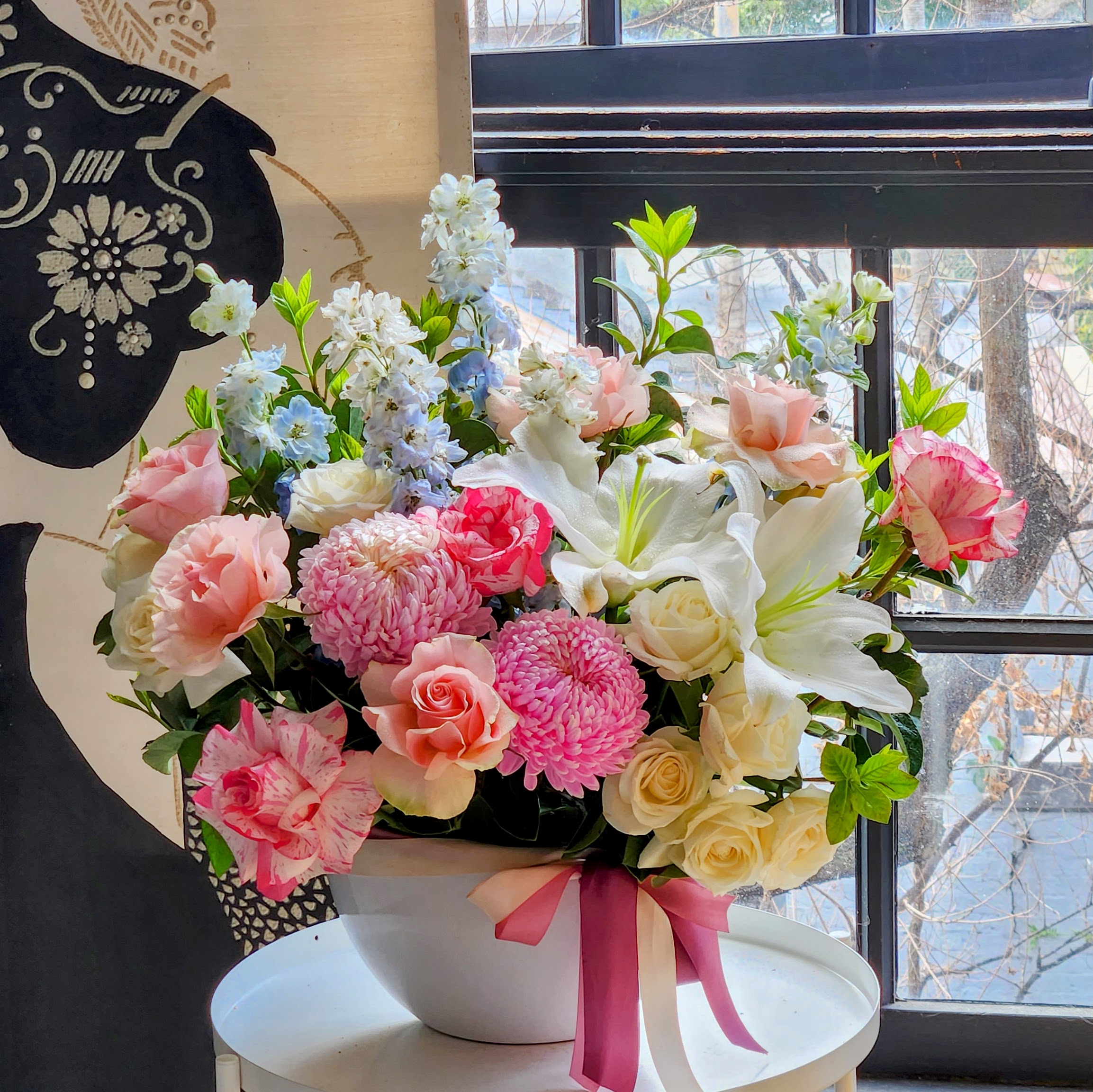 Pink Roses & Pascal Pink Chrysanthemums In A Pot | Flowers With Passion