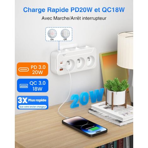 1 Multiprise 3 Prises Française, Rotative 90 Degrés, USB-C PD20W, USB-A ...