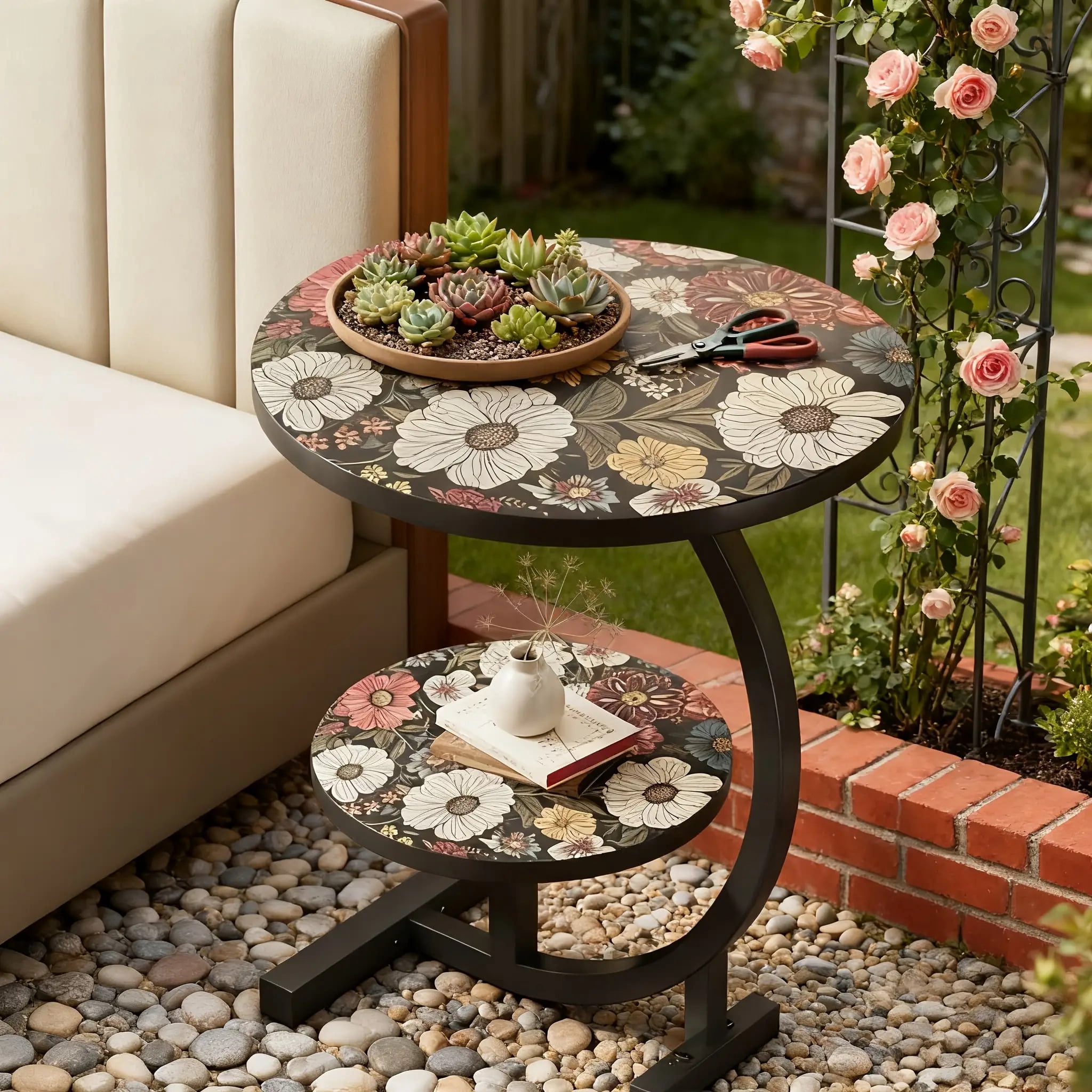 3-in-1 Metal Edge Double-Layer Round End Table with Floral Pattern ...