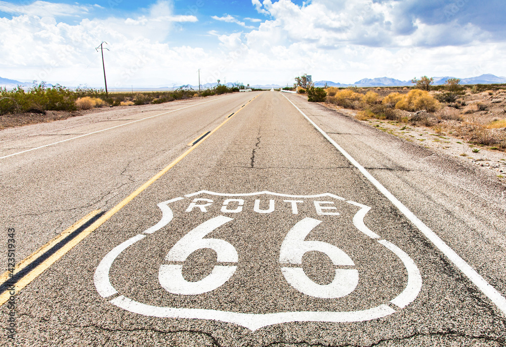 Legendary "Route 66" sign with a scenic desert landscape, open road ...