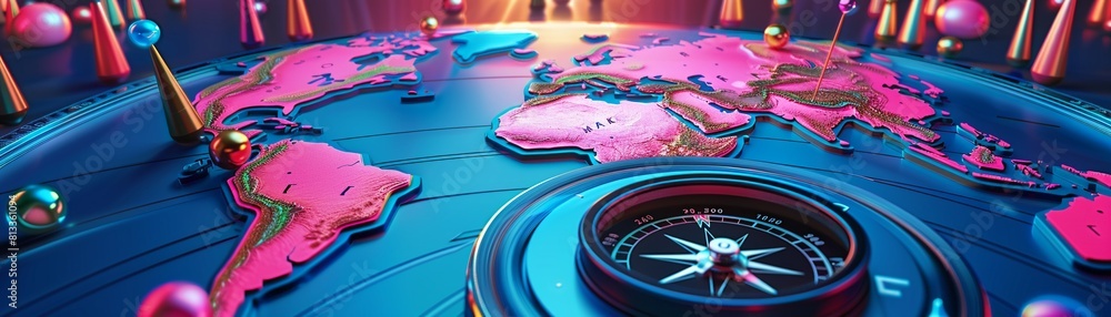 Magnetic compass and pins marking routes on a world map, representing ...