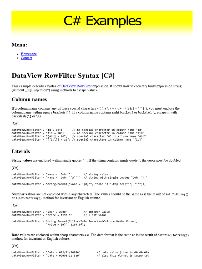 DataView RowFilter Syntax Guide | PDF | String (Computer Science ...