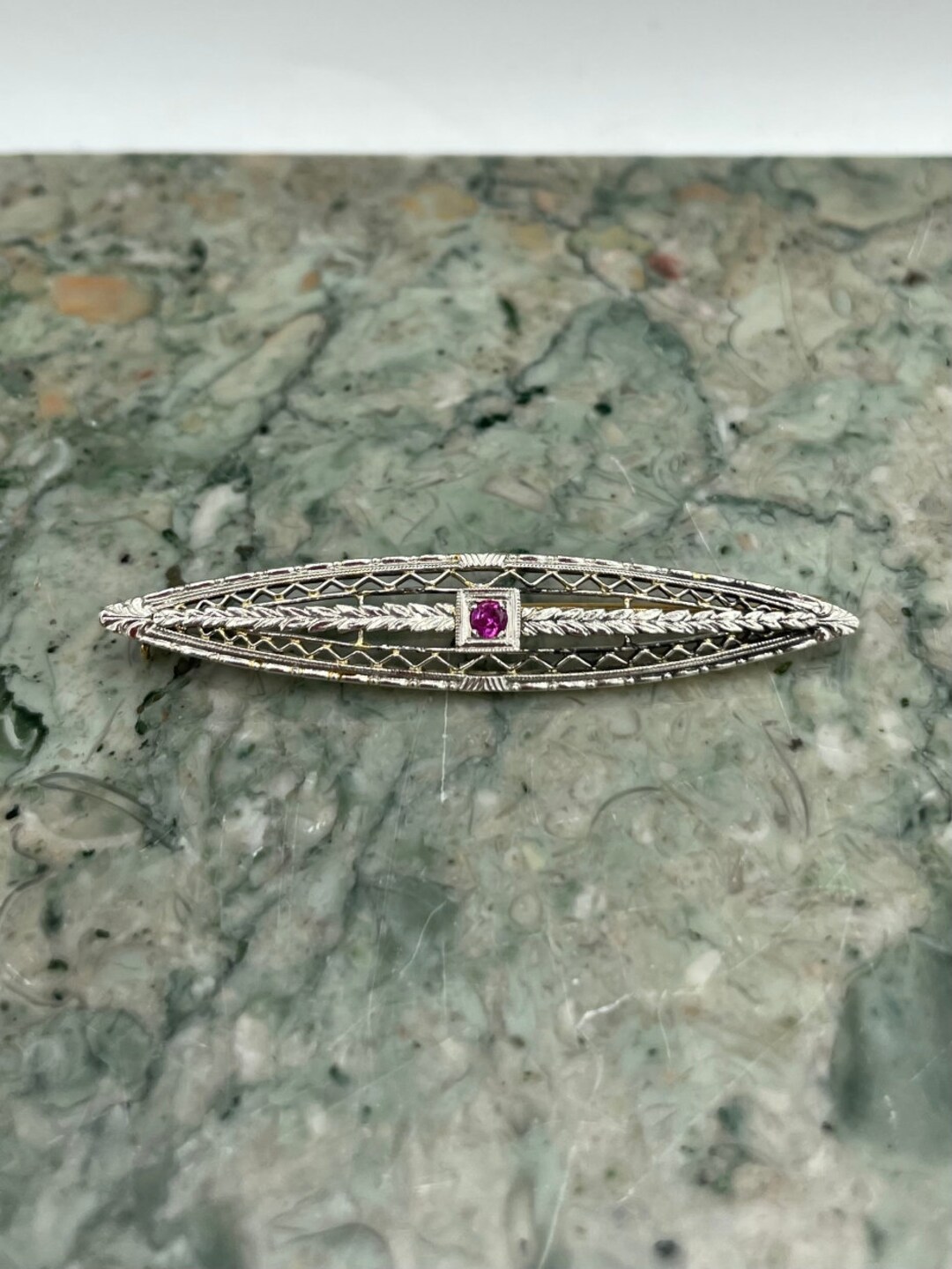 ANTIQUE VICTORIAN BAR PIN~14K WHITE GOLD~RUBY FILIGREE | #17100746