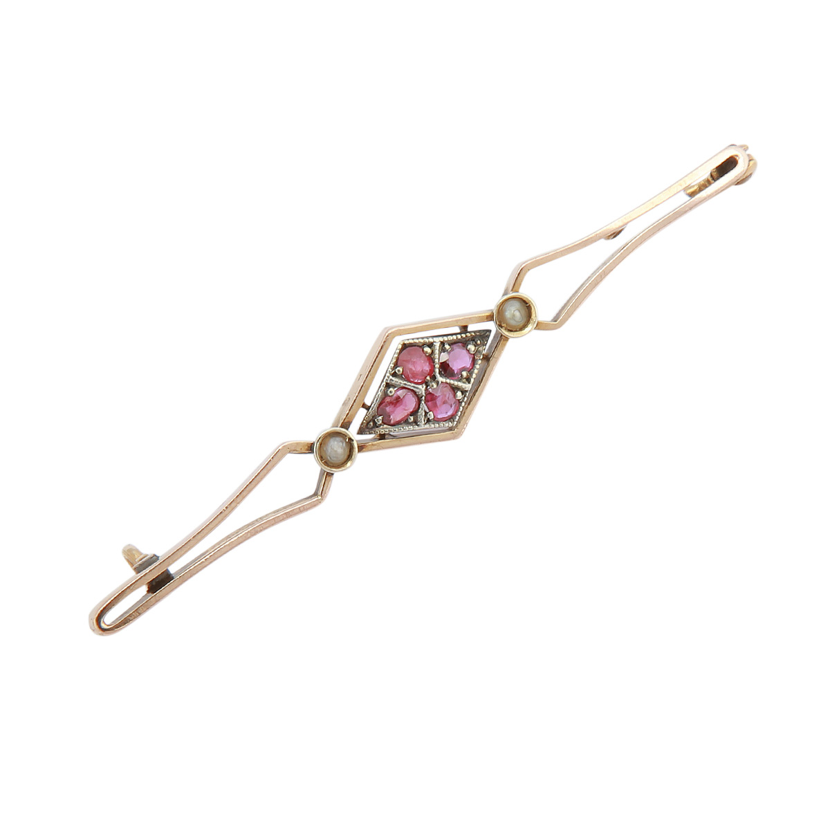 Edwardian 9ct pearl and ruby bar brooch - Valentine’s Antique Gallery