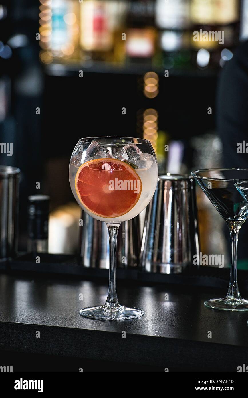refreshing ruby red coctail with grape fruit isolated on a bar ...
