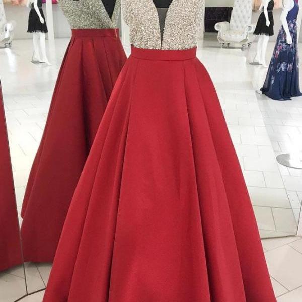 Red V-Neck Beaded Satin Prom Dress,Red Backless Evening Dress on Luulla
