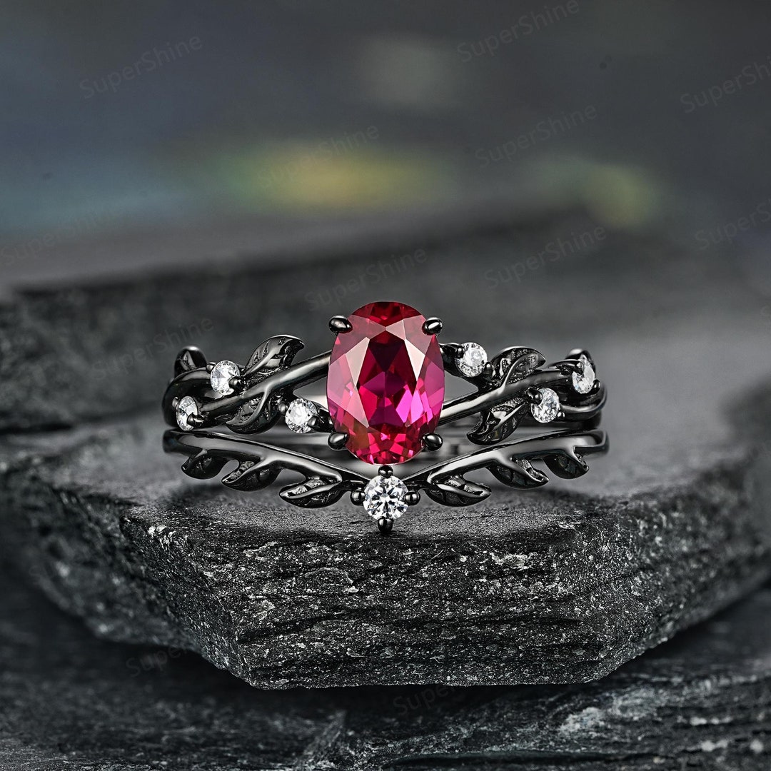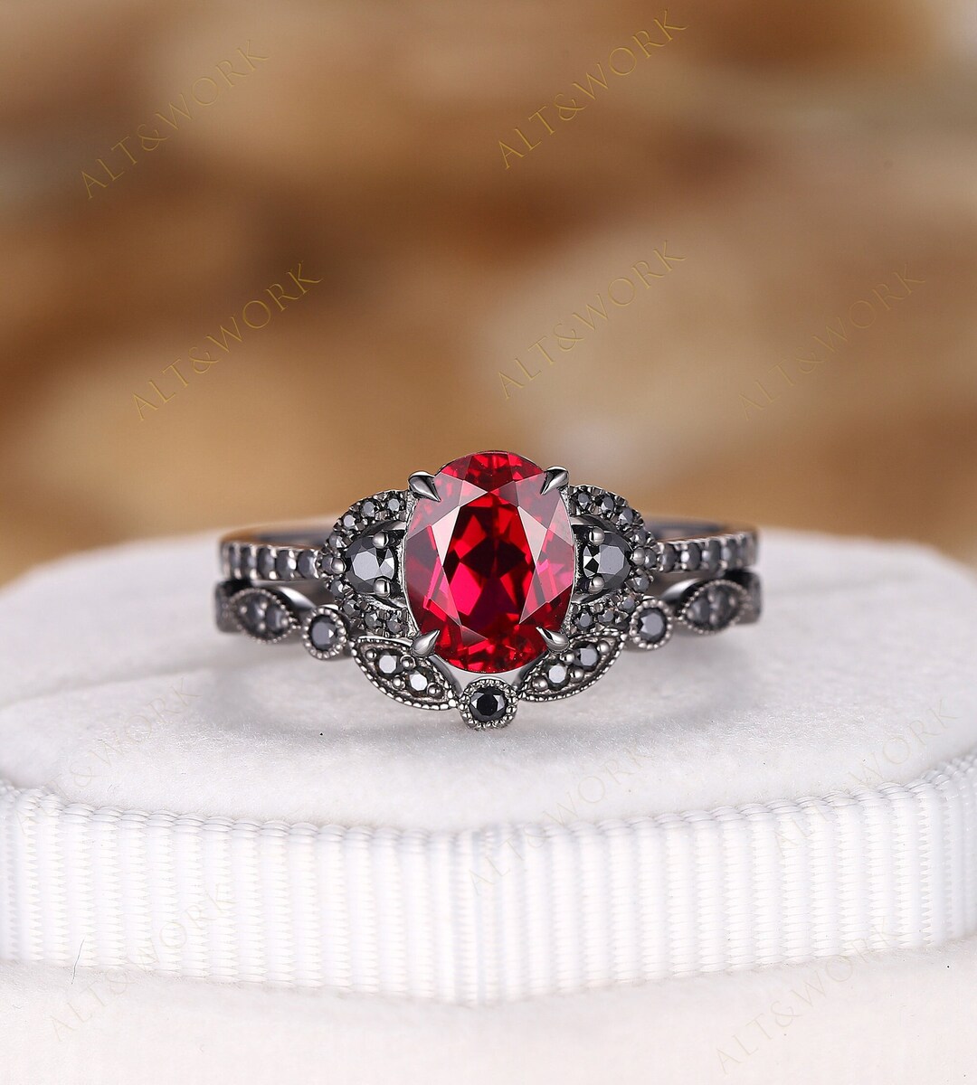 Oval Shape Ruby Gothic Engagement Ring Set Vintage Rhodium Black Gold ...