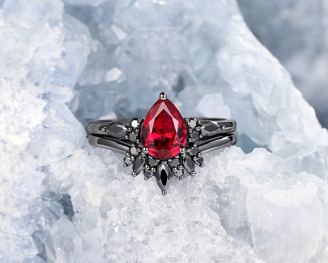 Pear Cut Ruby Gothic Engagement Ring Set, Vintage 14K Black Gold Red ...