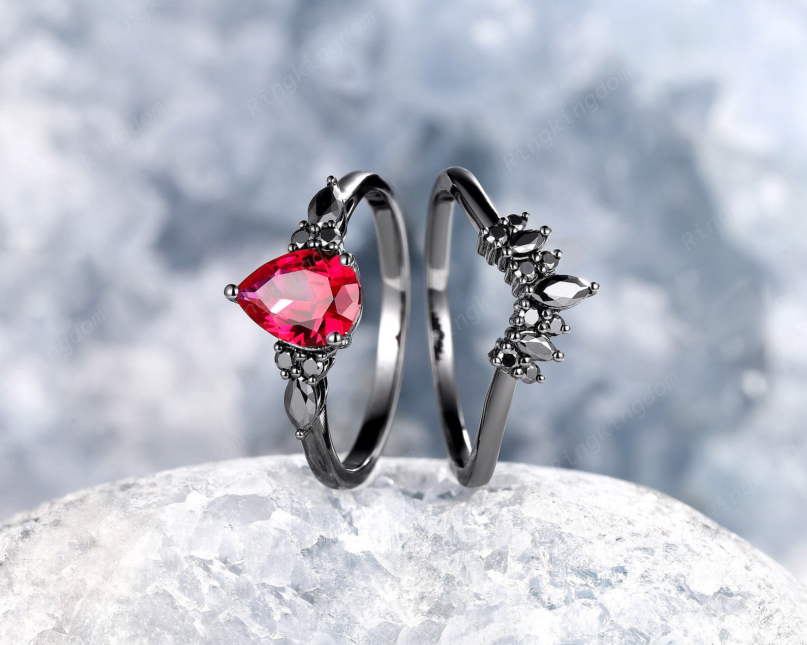 Gothic Black Gold Ruby Engagement Ring Set Unique Pear Shape - Etsy