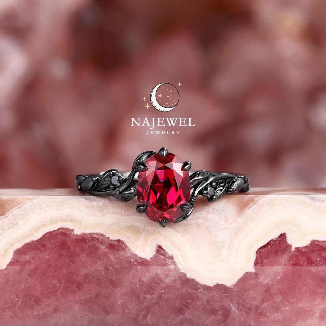 Gothic Oval Shape Ruby and Black Moissanite Engagement Ring Set ...