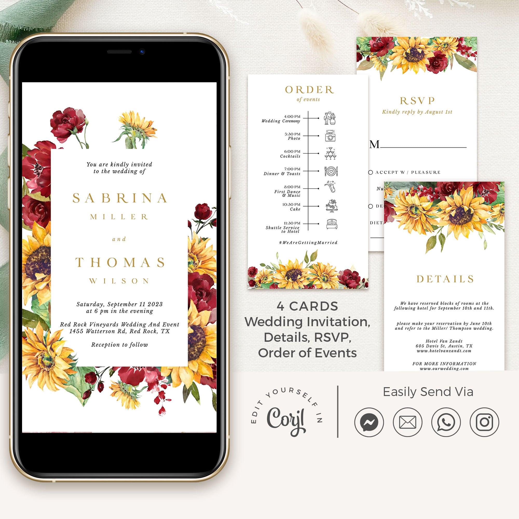 RUBY Red Roses and Sunflower Wedding Invitation Card Template ...