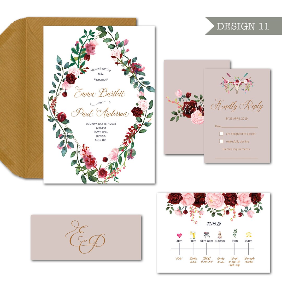 Boho Floral Timeline Blush Ruby Wedding Invitation Package With Invite ...