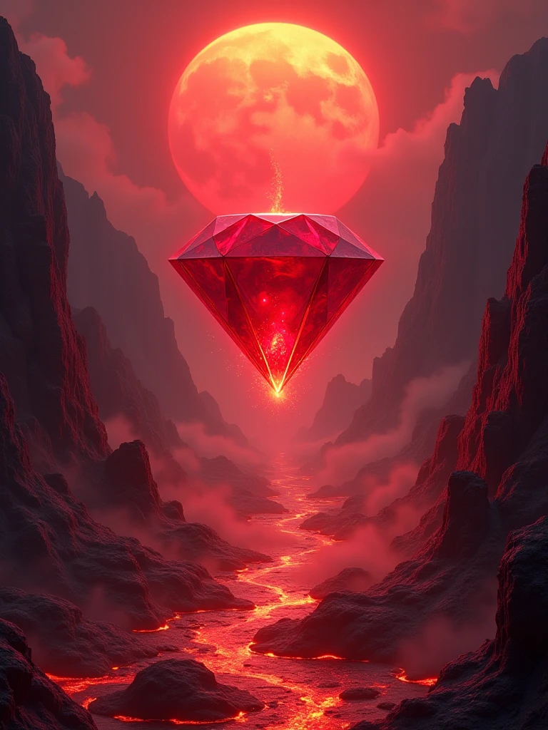 Red ruby floating fire lava rocks mountains red sun - SeaArt AI