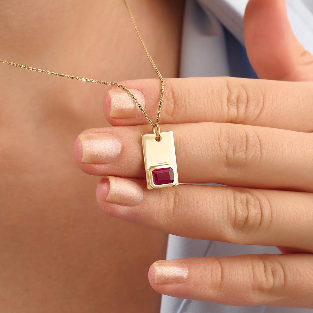 14k Gold Ruby Tag Necklace – Dainty Bezel Set Rectangle Pendant for ...