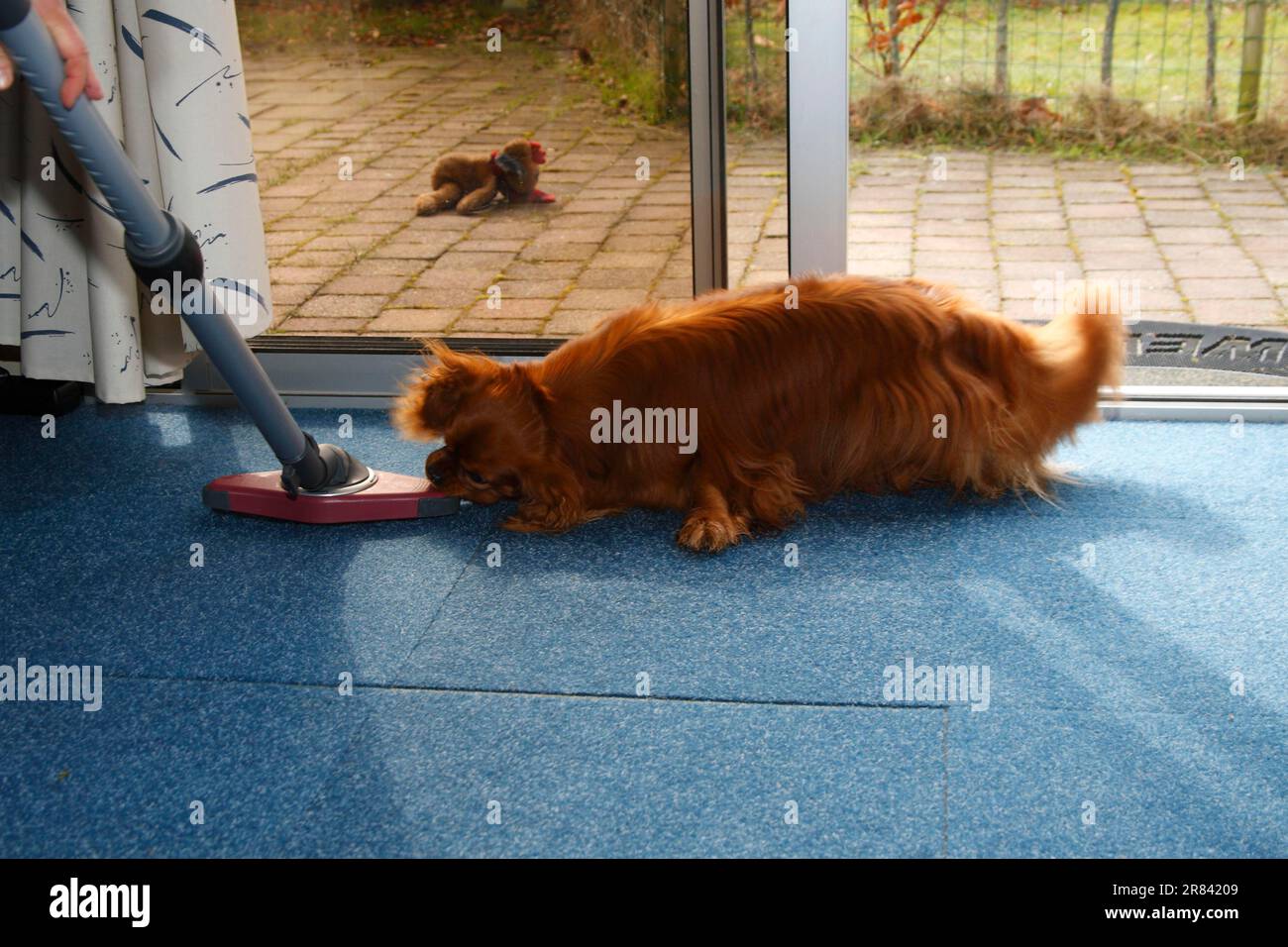 Cavalier King Charles Spaniel, ruby, vacuum cleaner Stock Photo - Alamy