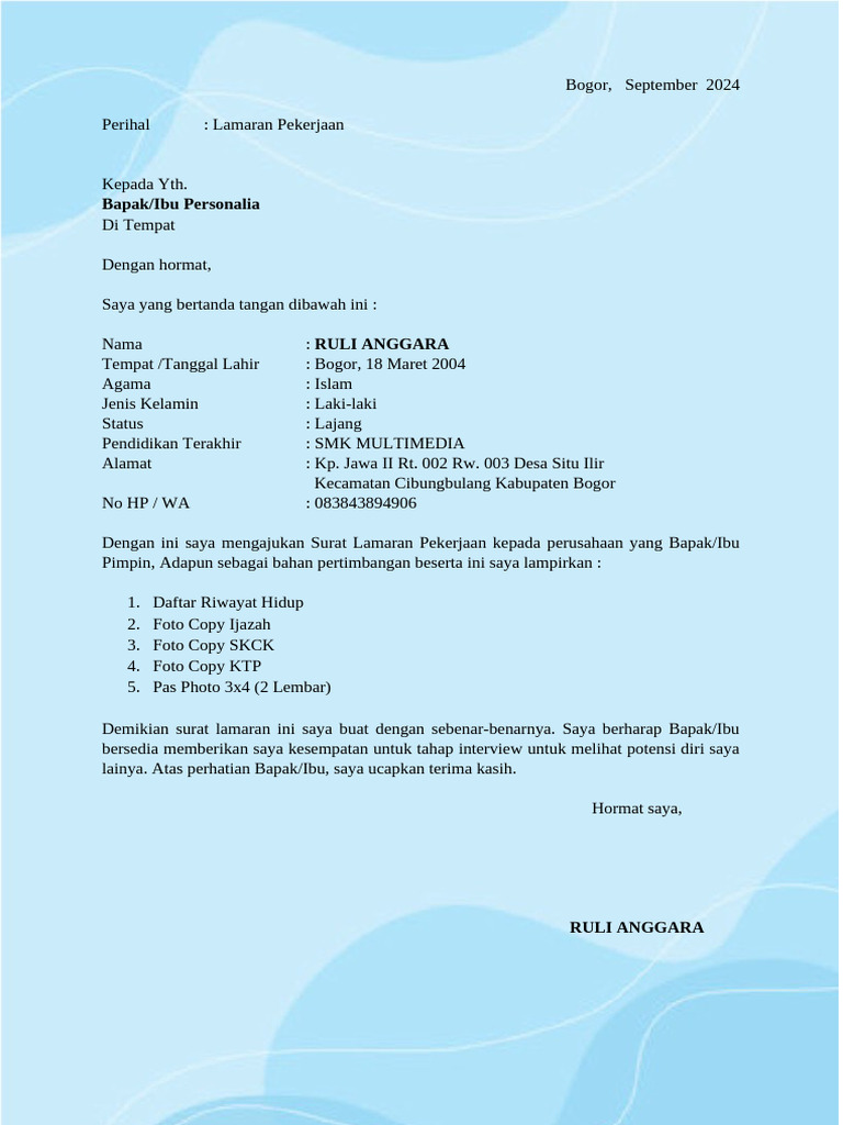 Surat Lamaran Kerja Ruli Anggara | PDF