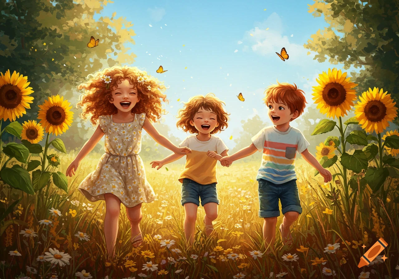 Three happy children, two girls and a boy, run hand-in-hand through a ...