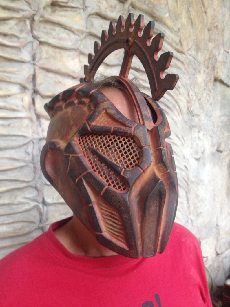 Rust-colored, medieval-inspired helmet with intricate detailing and a ...
