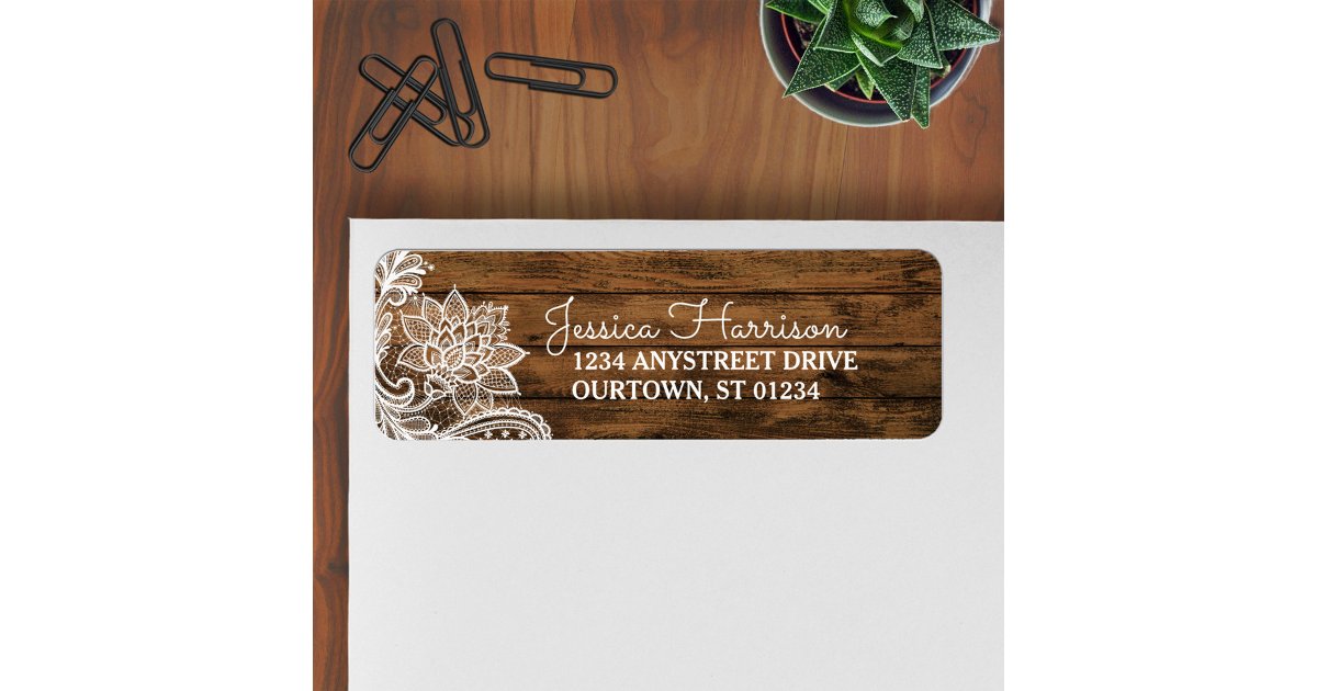 Rustic Wood & Vintage Lace Wedding Return Address Label | Zazzle