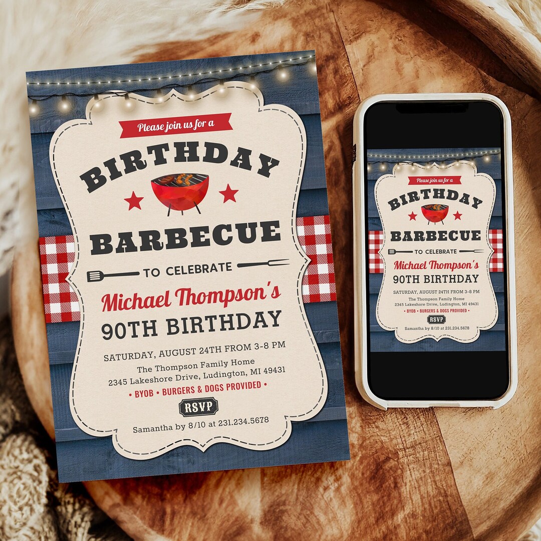 90th BBQ Birthday Invite - Summer Barbecue Party Invitation - Rustic ...