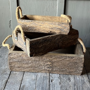 Set of 3 - Rustic Wooden Box W/ Live Edge Bark Rope Handles Cabin ...