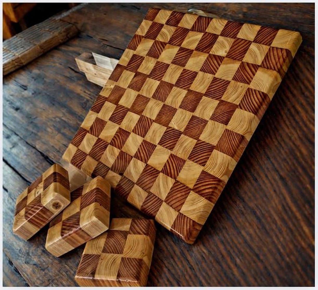 Rustic Checkerboard Cutting Board & Coaster Set – Handcrafted Natural ...