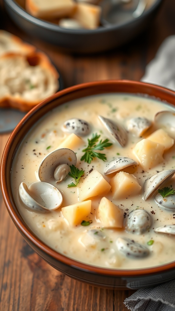 Delicious clam chowder served in a rustic bowl with fresh herbs and ...
