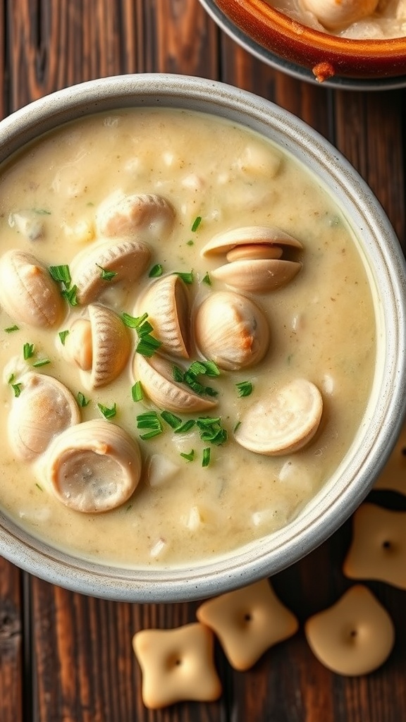 Creamy clam chowder in a rustic bowl, garnished with fresh herbs ...