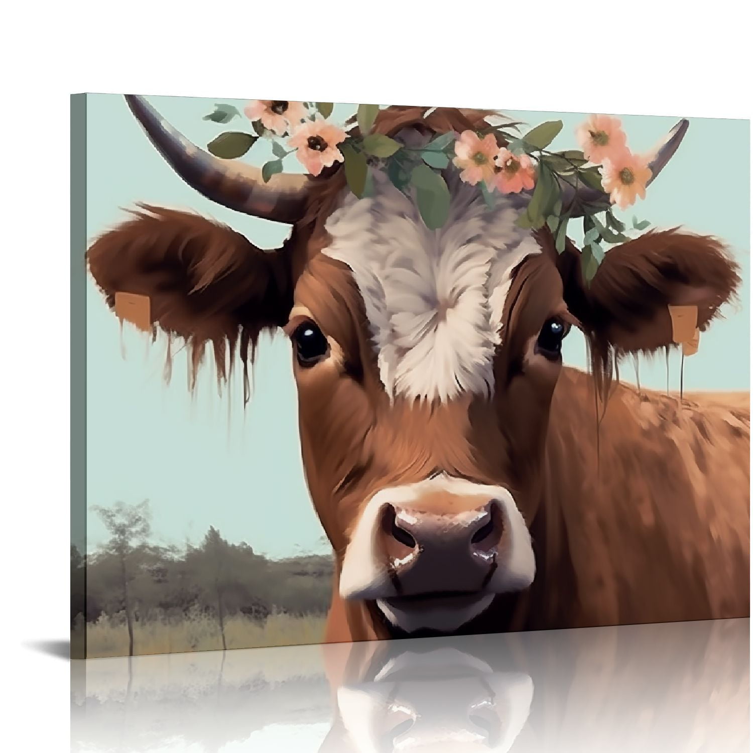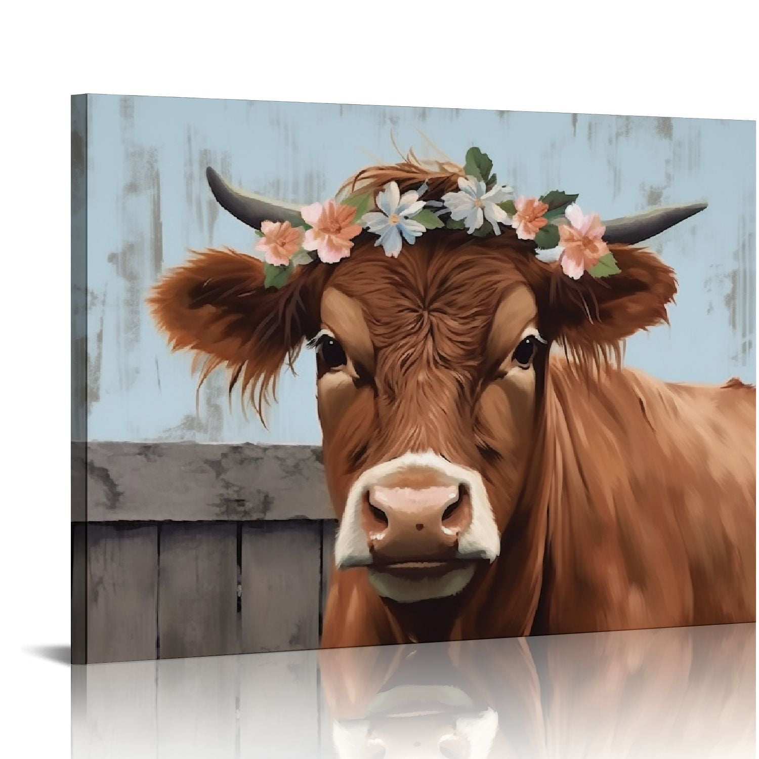 Rustic Cow Canvas Art With Floral Crowns, Farmhouse Chic Wall Decor ...