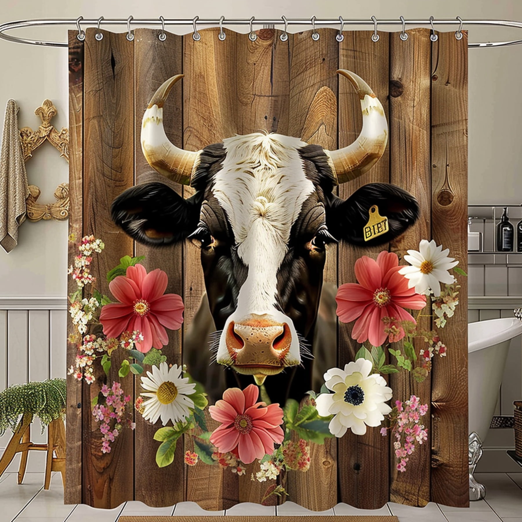 Rustic Cow Head and Floral Design Wooden Bathroom Shower Curtain ...
