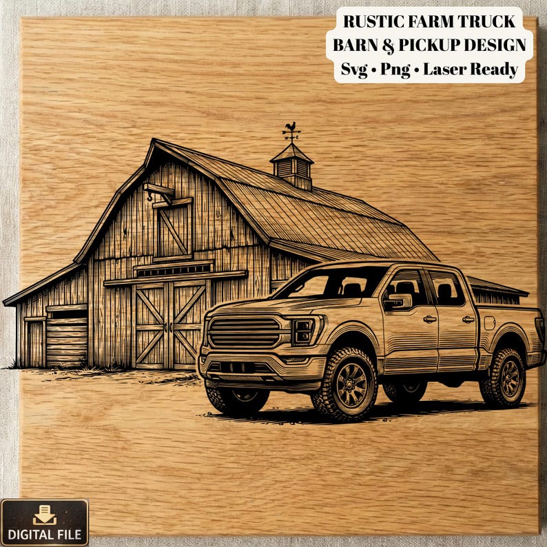 Rustic Farm Scene SVG: Barn and Pickup Truck Engraving Design (digital ...