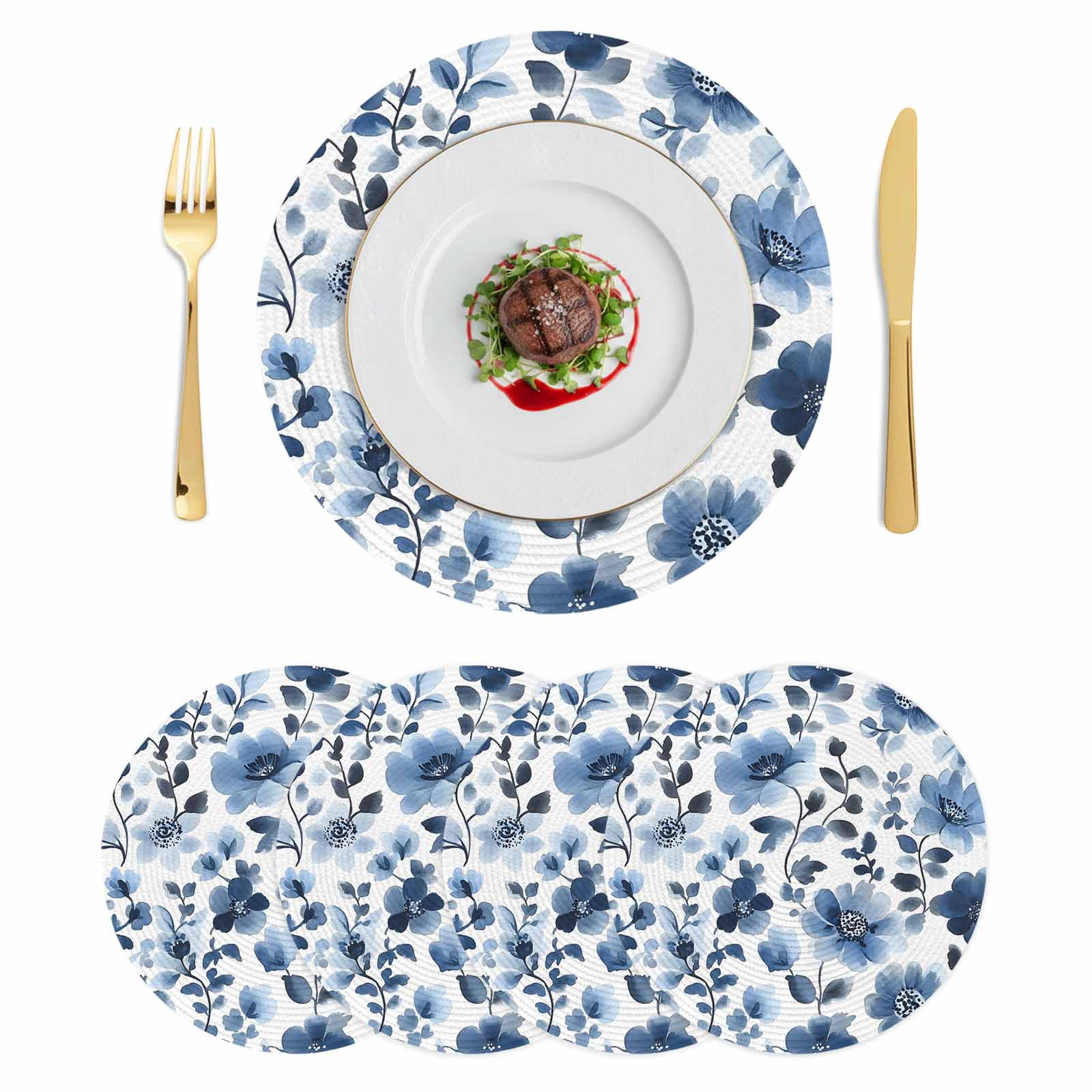 Blue Flowers Round 13 Inch Placemats Set of 4, Spring Rustic Watercolor ...