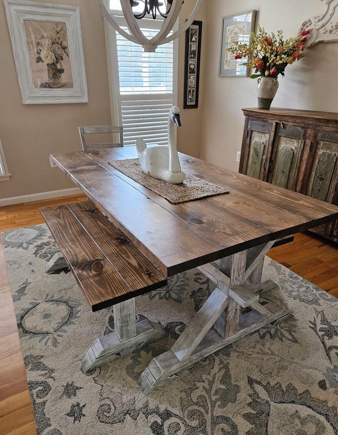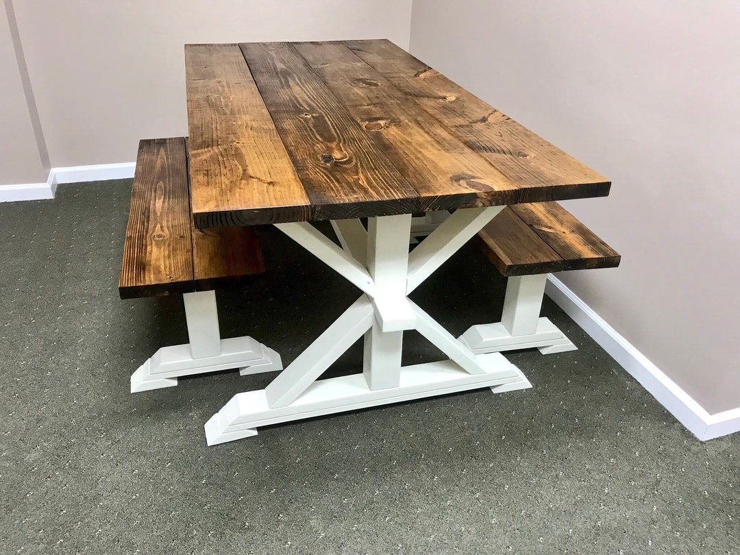 Rustic Farmhouse Table with Benches: Dark Walnut Top, Weathered White Base