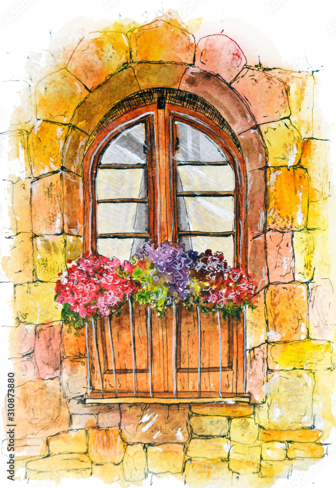 window in an old house stone flowers watercolor drawing illustration ...