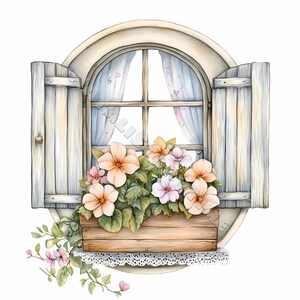 'Watercolor Traditional Old-Fashioned Window with Potted Flowers on ...