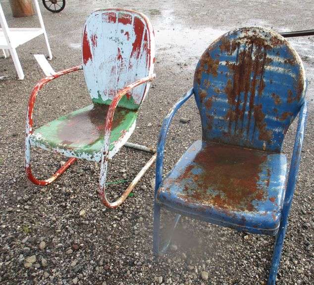 (2) Outdoor metal chairs, rusty but no rust holes, one needs bolts ...