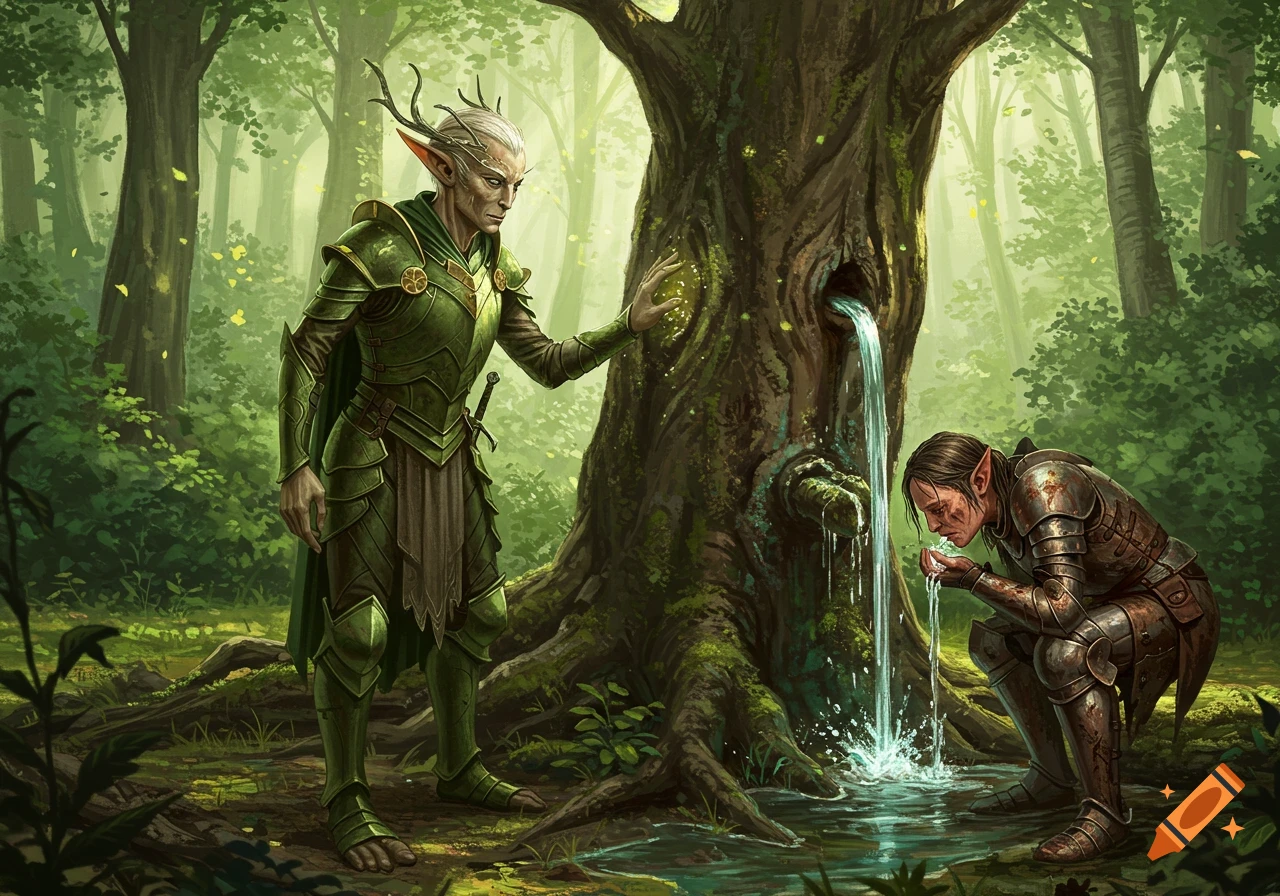 An elf in green armor touches a magical tree as a rusty-armored knight ...