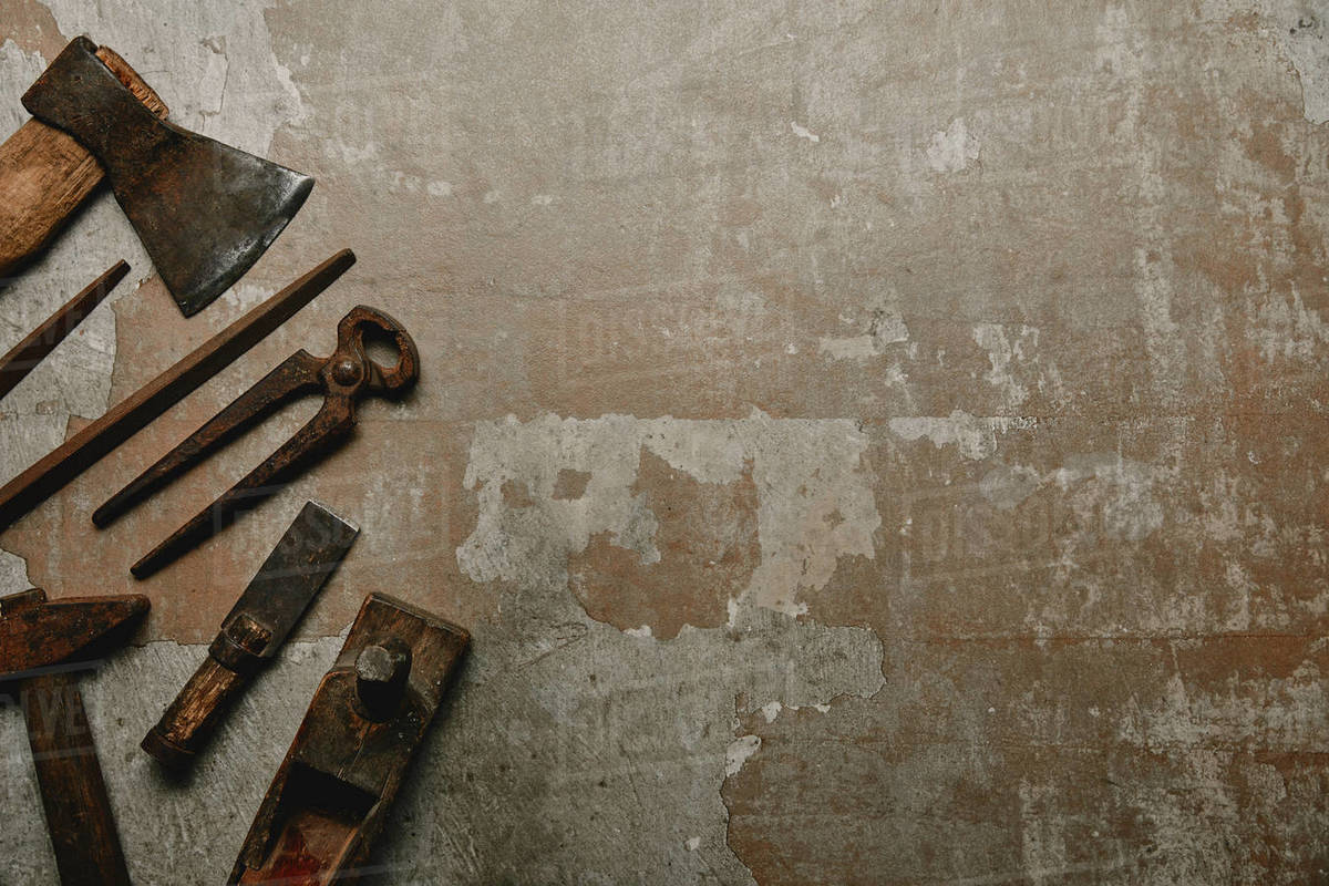 Top view of vintage rusty instruments on old background - Stock Photo ...