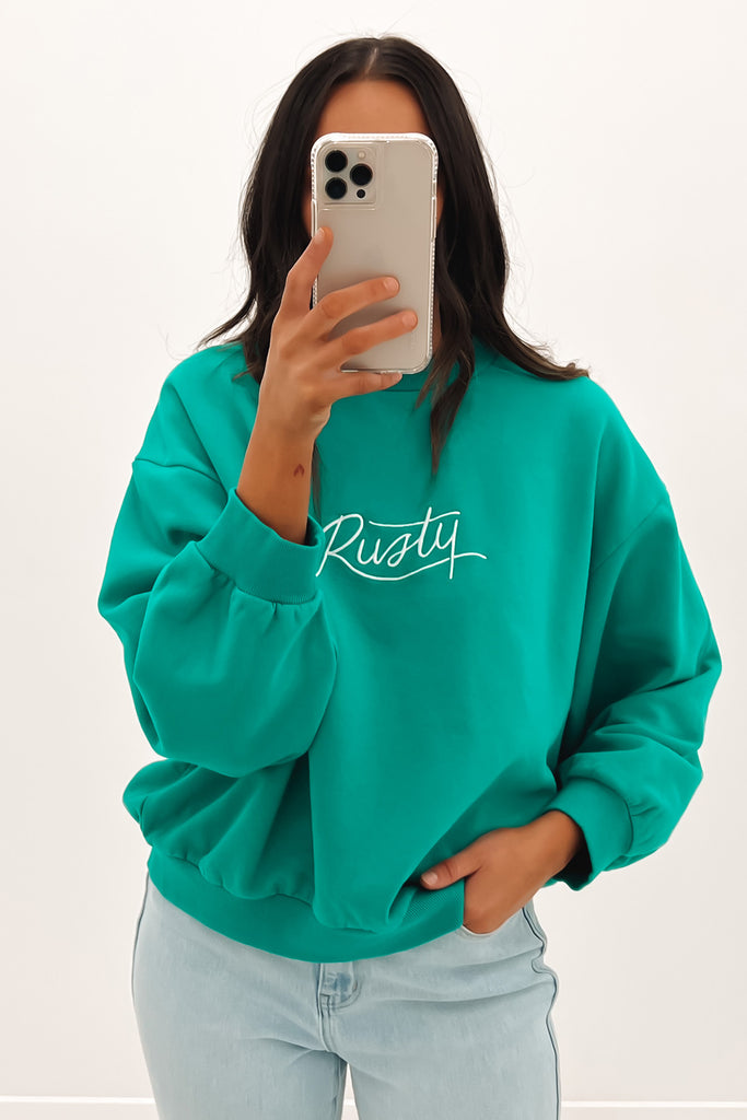 Rusty Script Oversize Crew Neck Fleece Emerald - Jean Jail