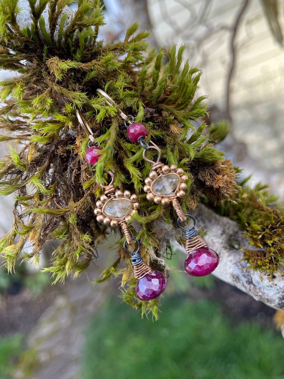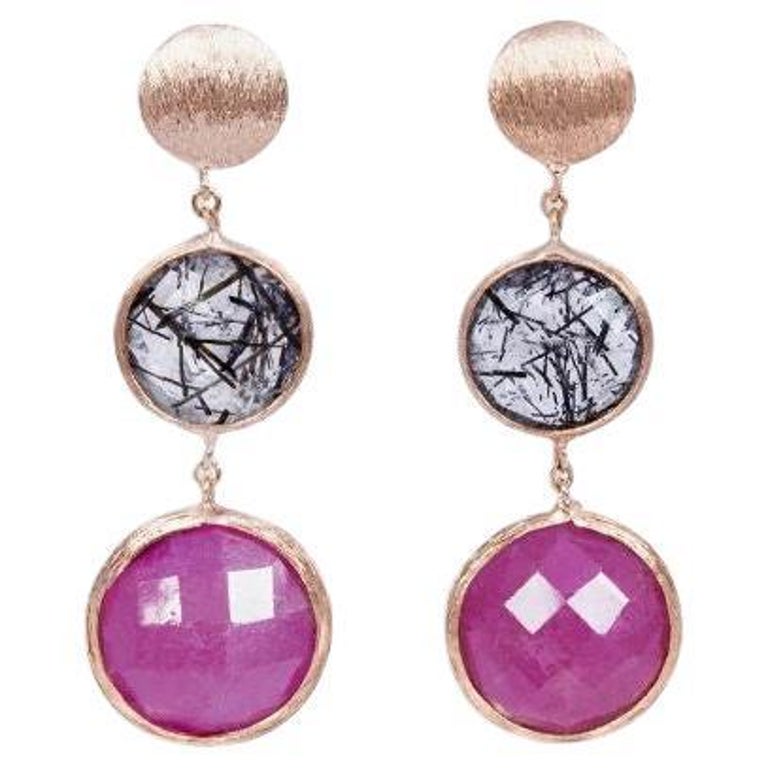 14k Satin Rose Gold Drop Earrings with Black Rutilated Quartz and Ruby ...