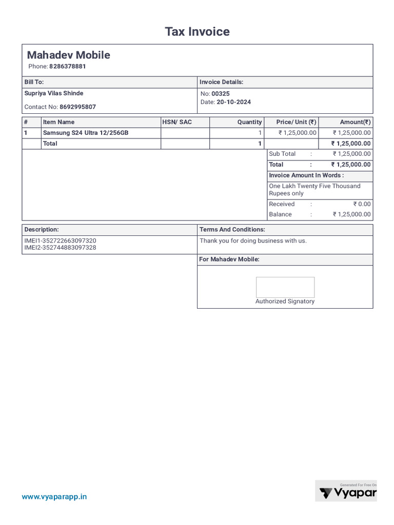 Tax Invoice for Samsung S24 Ultra | PDF