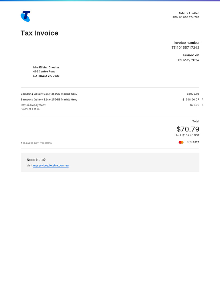 Telstra Invoice for Samsung Galaxy S24+ | PDF