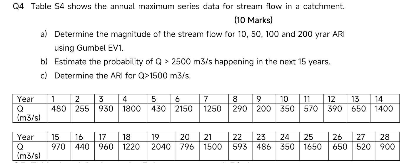 Solved Q4 Table S4 shows the annual maximum series data for | Chegg.com