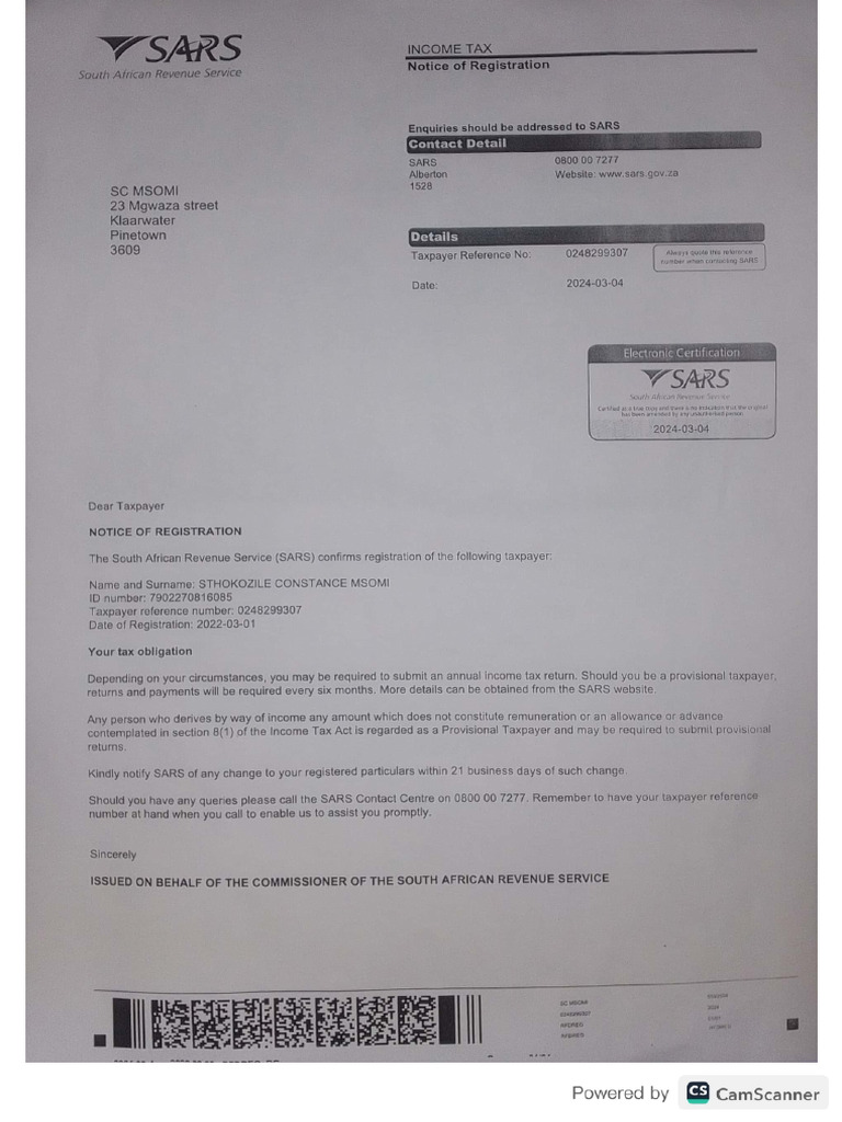 SARS Notice of Registration Details | PDF | Taxes | Taxpayer
