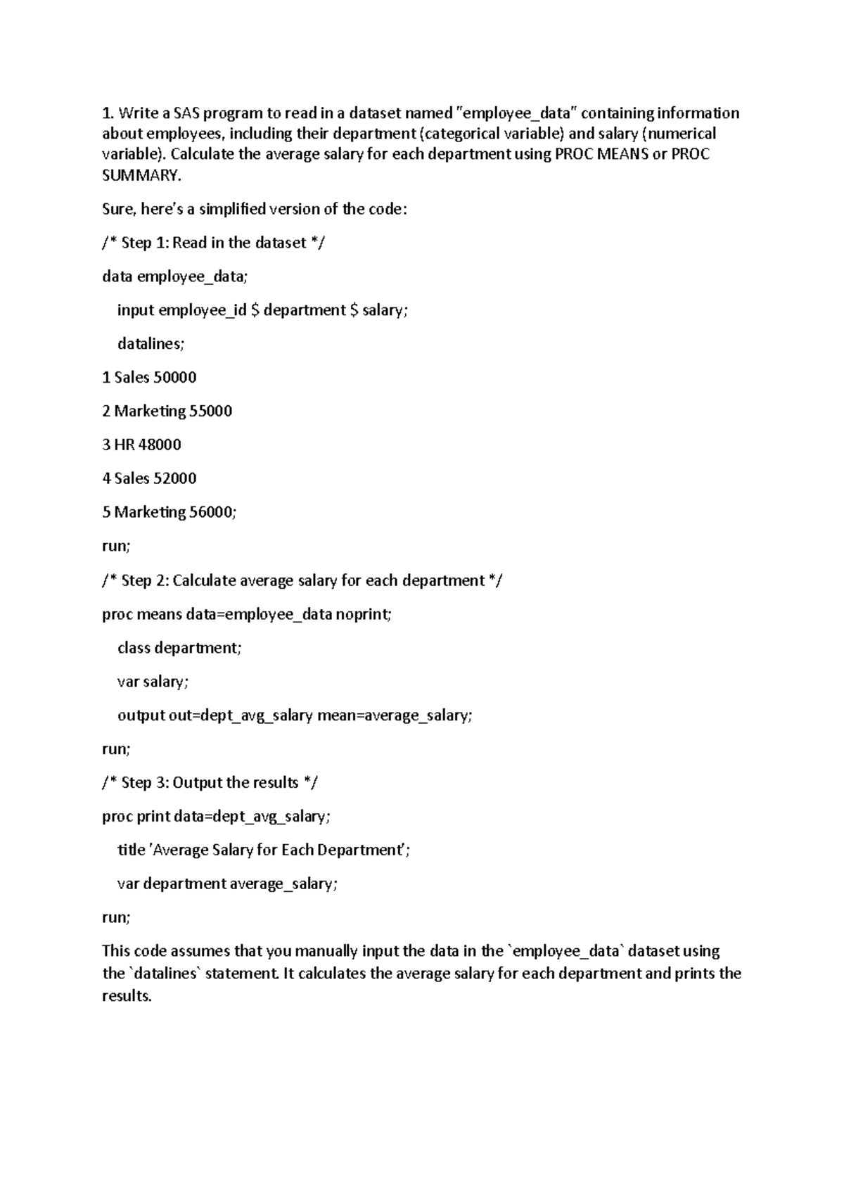 SAS Exercise - SET 1 - SAS EXERCISE - SET 1 Question 1 Write a SAS ...