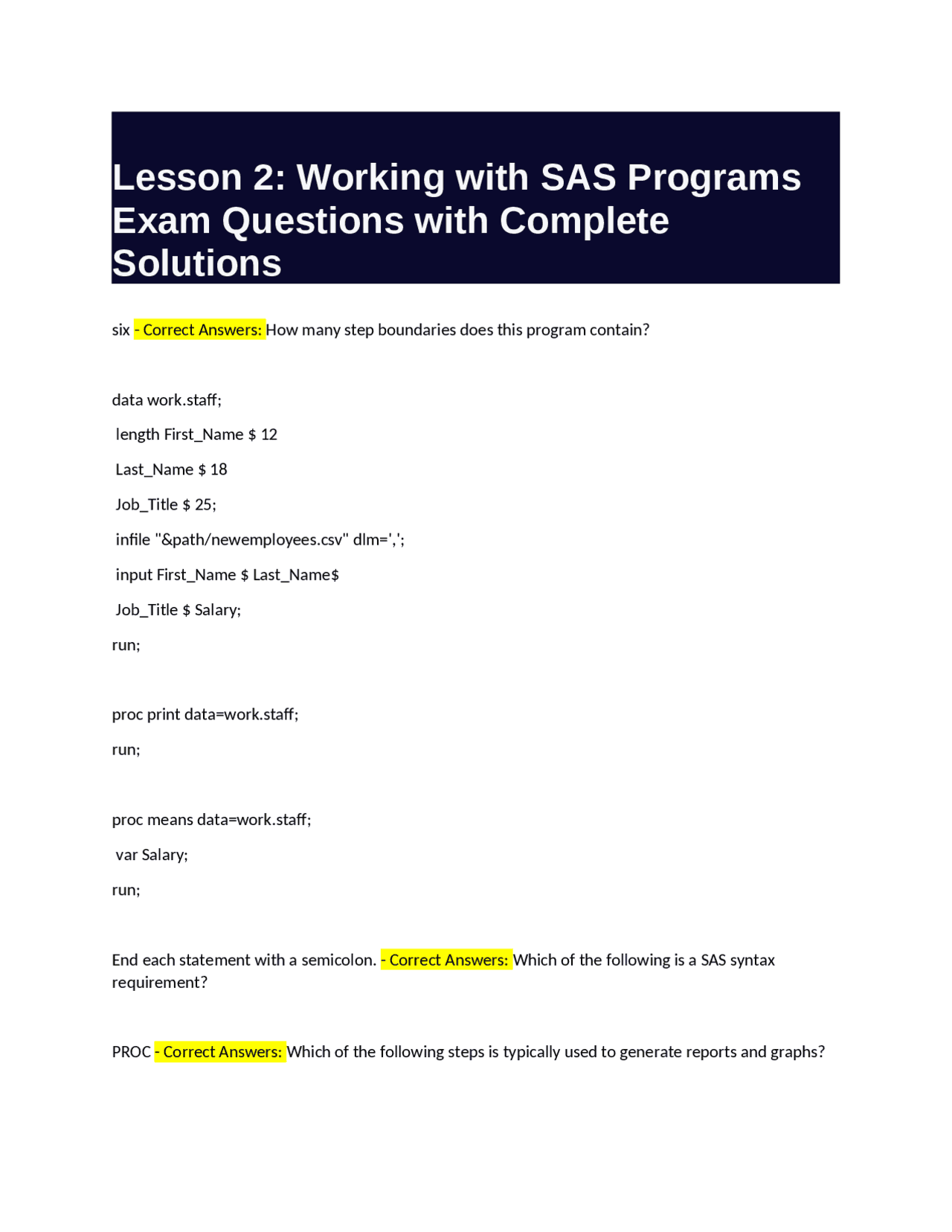Lesson 2 Working with SAS Programs Exam Questions and Complete ...