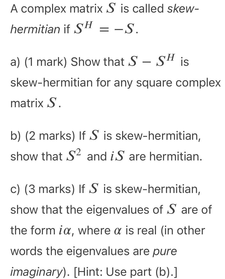 Solved A complex matrix S is called skew- hermitian if SH | Chegg.com