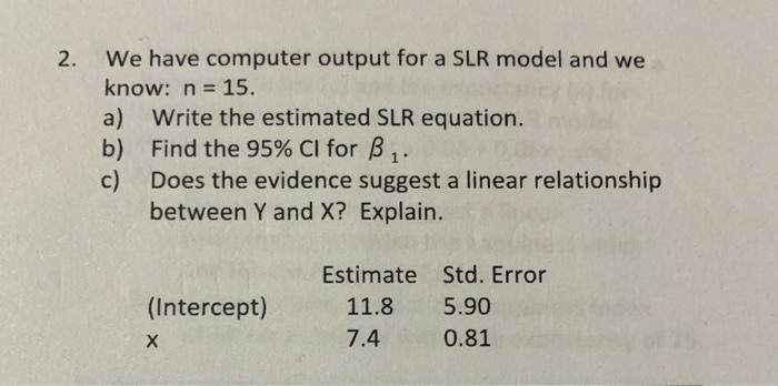 Solved 2. We have computer output for a SLR model and we | Chegg.com