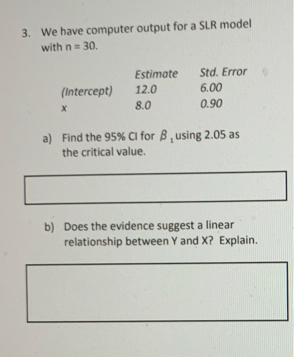 Solved 3. We have computer output for a SLR model with n = | Chegg.com