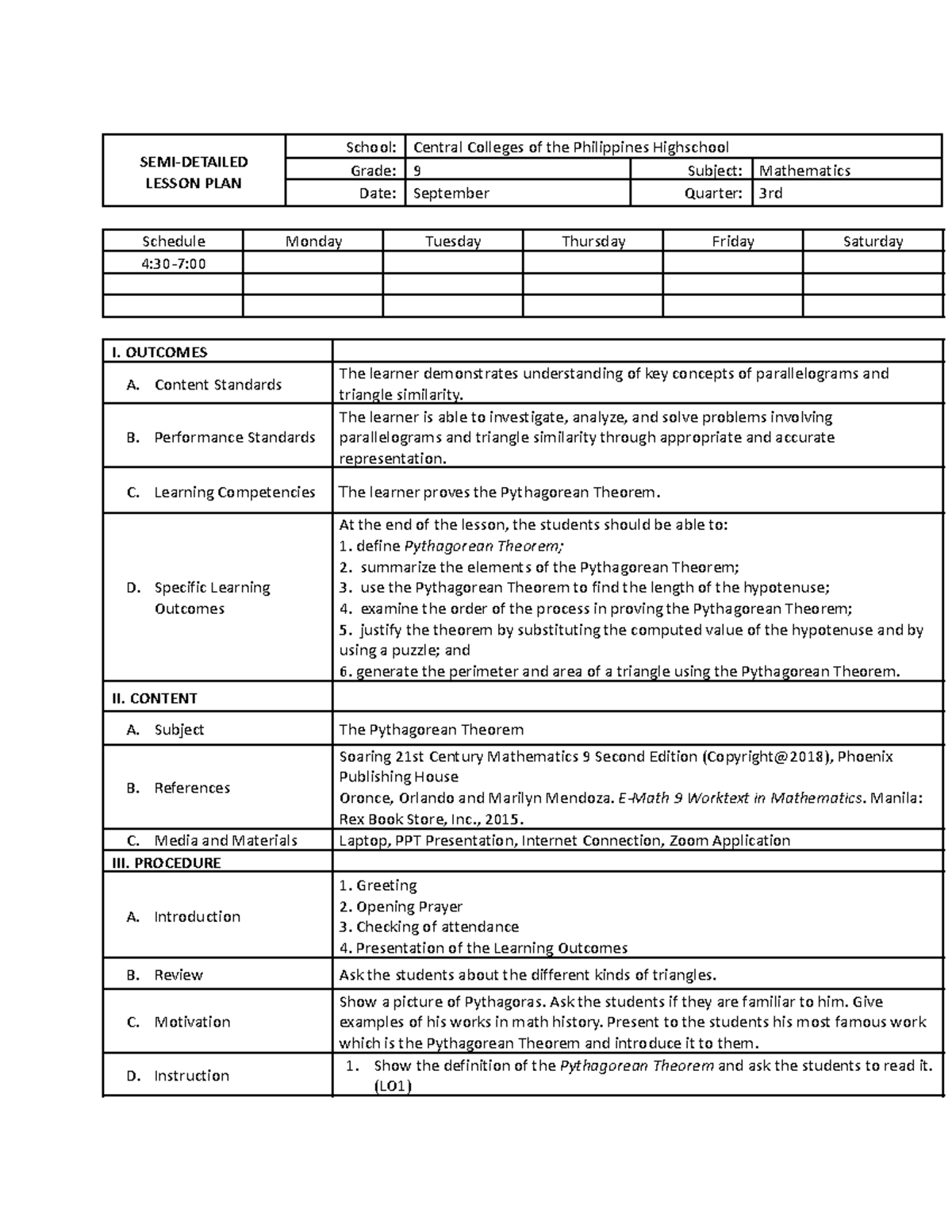 Semi-Detailed Lesson Plan on Pythagorean Theorem - Math 9 - Studocu